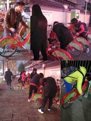 为深入开展志愿者活动,倡导服务他人,服务社会,快乐自己的志愿服务精神以及培养乐于助人,甘于奉献的精神品质, 2017年12月4日,数统院团总支开展以“给公共自行车擦擦脸”为主题的志愿活