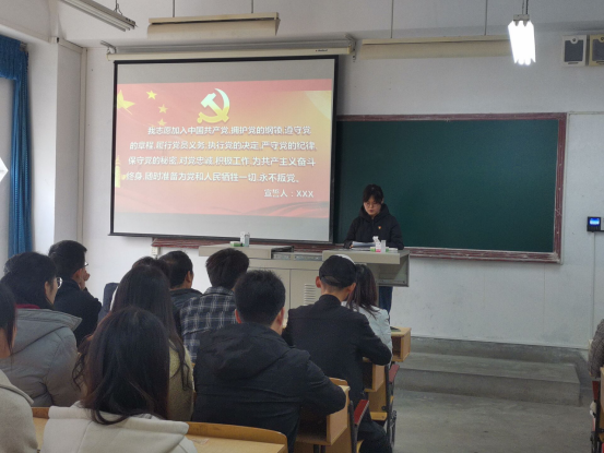 “我志愿加入中国共产党,拥护党的纲领,遵守党的章程... ...”2020年下半年发展入党的党员和支部老党员在支部组织委员刘佩同志的带领下,举起右拳,庄严宣誓。全体党员用发自内心的洪亮的声音表达对党忠诚的决心,接受了一次身心的洗礼。