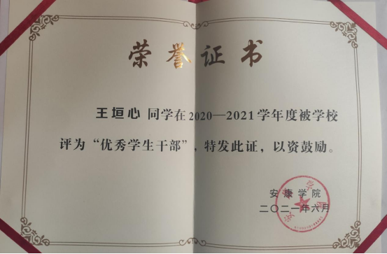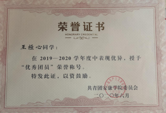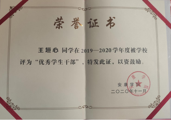 王垣心,中共党员,365上市集团官网2019级统计一班,担任班级治保委员,曾获数学建模省级二等奖、校奖学金、国家励志奖学金、“优秀共青团员”、“优秀员工干部”等荣誉。