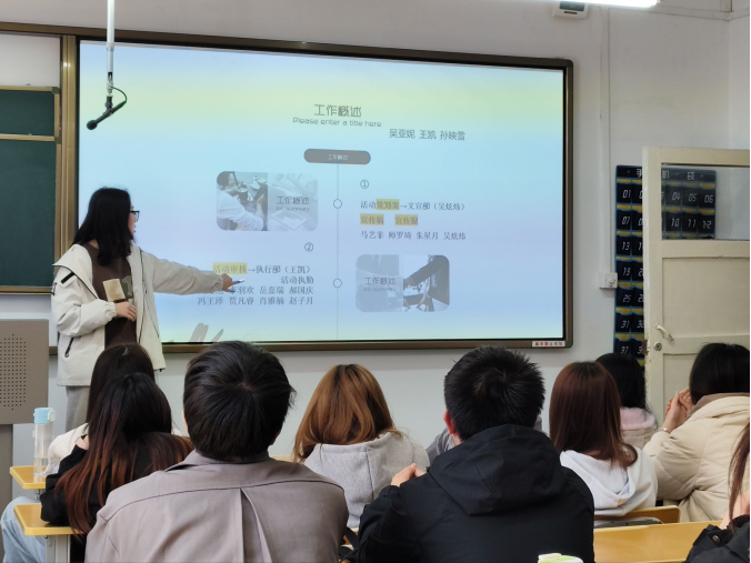 随后,社团负责人吴亚妮围绕新学期社团整体工作规划进行详细解读与安排。她以 “分工明确、高效协同” 为核心原则,结合社团发展目标与活动计划,对各部门工作职责进行清晰划分、周密部署,明确了新学期的工作重点、任务分工与推进要求。