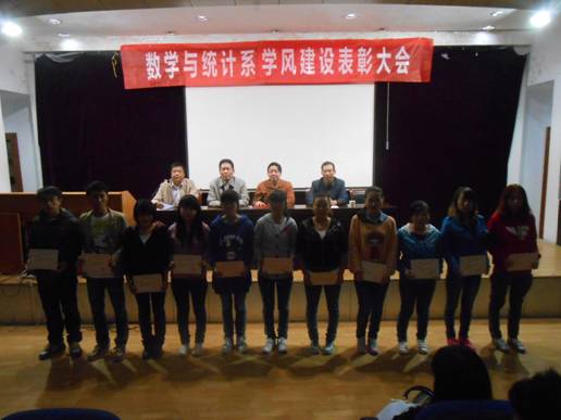 10月16日晚,数统系在1号教学楼6楼报告厅召开了学风建设2012—2013学年表彰暨2013—2014学年动员大会。系党总支书记郭全寿,系主任赵临龙,副主任汪义瑞,学工办主任马新华,辅导员王宗庆、张远秀,教师代表邵春芳老师参加了会议,会议由马新华主持。