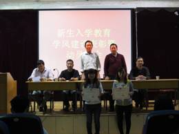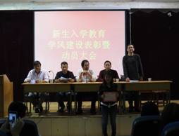 会议由马新华主持,大会内容分为两项。第一项是新生入学教育和学风建设表彰。副主任王昭海宣读了2013~2014学年学风建设活动中三好员工、优秀员工干部、数学竞赛以及英语六级考试等获奖员工名单,并提出表扬。系主任赵临龙,党总支书记郭全寿为获得奖学金的同学颁发荣誉证书,以鼓励大家向优秀者学习,提倡大家要积极参加各类活动、比赛,丰富老员工活,锻炼意志,增长课外知识。2012级数应专业和2014级数应专业员工分别代表老生和新生发言,他们立志与时俱进,提高自我,做社会的有用人才,用实际行动弘扬青春。