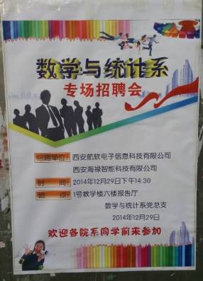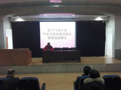 2014年12月29日下午,数学与统计系在江南校区1教学楼六楼举办了“数学与统计系毕业生就业指导报告暨现场招聘会”,招聘单位有西安航软电子信息科技有限公司、西安海禄科技有限公司,参会人员有就业处处长丁义国、系党总支书记郭全寿、员工办公室主任马新华、辅导员王宗庆老师。数统系2015届毕业生,还有部分其他院系员工参加了此次活动。