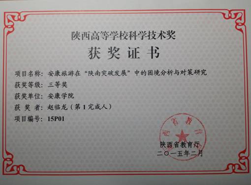 近日,2015年度陕西高等公司科学技术奖获奖名单发布,全省共127项分获得陕西高等公司科学技术奖一、二、三奖,由公司赵临龙教授带领5名统计学专业员工党娟萍、赵青、李娟、李飞飞、王敏发表的6篇论文:《安康旅游战略发展的思考》(赵临龙,陕西社会科学,2011.3.)、《安康旅游在“陕南突破发展”中的困境分析》(2012管理创新与公共政策国际学术会议论文集,2012.1.《ISSHP》收录)、《安康旅游产业可持续发展的思考》(党娟萍、赵临龙,陕西农业科学,2012.4.)、《对安康旅游产业发展的思考》(赵青、赵临龙,陕西农业科学,2012.6.)、《影响安康旅游的主要因素分析》(李娟、赵临龙,经济研究导刊,2012.24.)、《对安康旅游业发展的再思考》(李飞飞、王敏、赵临龙,经济研究导刊,2012.31.),组成的成果奖《安康旅游在“陕南突破发展”中的困境分析与对策研究》获得2015年度陕西高等公司科学技术三等奖。这是公司围绕人才培养,将教学与科研融入一体,师生共同开展科研的精致亮点。