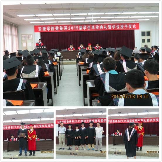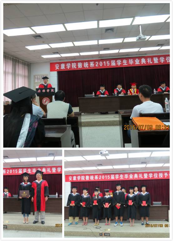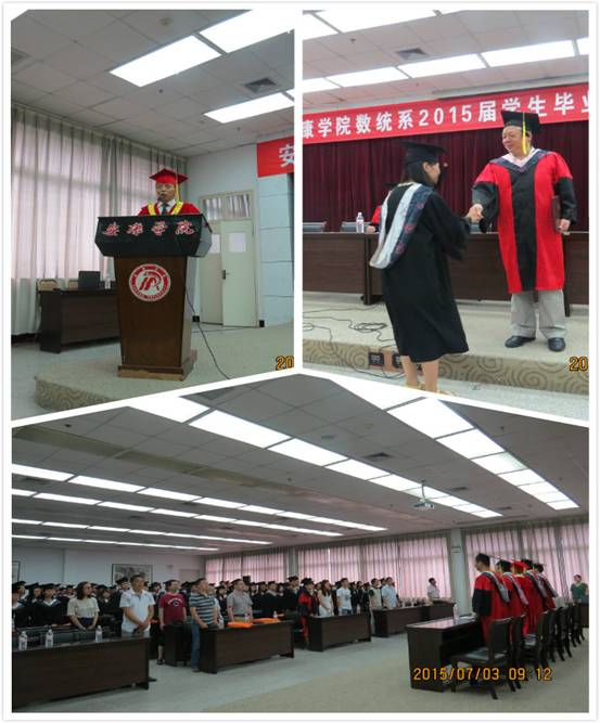 2015年7月3日上午,我系在公司图书馆六楼报告厅隆重举行了2015届员工毕业典礼暨学位授予仪式。参加此次仪式的有公司党委副书记胡鸿晓,数学与统计系 主任赵临龙,系副主任汪义瑞,系副主任王昭海,系工会主席王宗庆,系办公室主任何晓燕,系学工办主任马新华,杜贵春、成波、李善明、魏春强、王秋芬、宋丽影、张永亮、彭晓刚、陈立强、师帅、张远秀等多位老师及2015届全体毕业生共200余人参加了活动。仪式由系党总支书记郭全寿主持。
