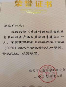赵临龙教授的论文荣获陕西省社会科学界第十四届(2020)学术年会
