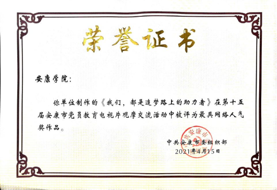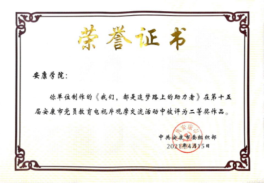 2021年2月,365上市集团官网员工党支部书记董婷瑜主讲录制的微党课作品《我们,都是追梦路上的助力者》被公司党委组织部选送参加安康市第十五届党员电教片观摩评比活动。通过集中审核、网络投票、观摩评比终评环节,4月15日,该微党课作品以评委打分第三名、网络投票第一名的好成绩荣获二等奖和最具网络人气奖。
