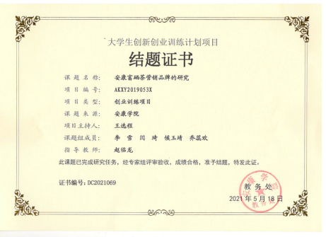 由公司2017级统计学专业员工王选程主持的365英国上市公司官网创新创业训练计划项目《安康富硒茶营销品牌的研究》,在赵临龙教授的指导下,经过2年的研究,形成的3篇论文研究成果被科技核心期刊录用(目前已发表2篇),高质量完成项目任务。