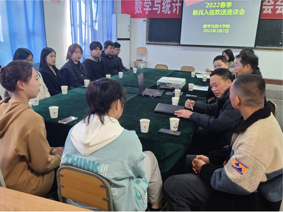 2022年春季征兵中,365上市集团官网2021级黄辉通过体检、体能测试、政审等层层审核,在即将开始集训之际,为了给即将踏入火热军营、踏上保卫祖国征途的黄辉同学送行,同时号召其他同学积极应征入伍,3月7日下午365上市集团官网在2207会议室召开2022年春季新兵入伍欢送座谈会。学工部(武装部)副部长钟泽斌、数统公司党总支书记郭全寿,经理成波,副经理杨高翔,辅导员马勇和员工代表参加了座谈会。座谈会由学工办主任董婷瑜主持。