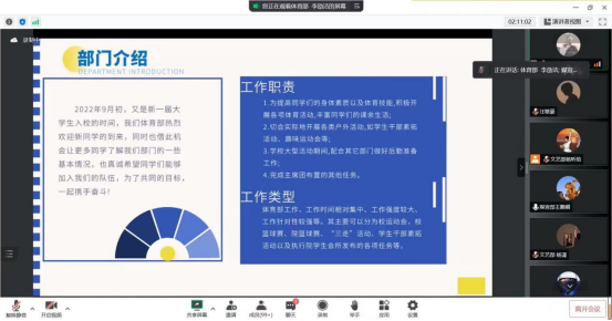 宣讲会伊始,各部门负责人以中心工作为切入点,向同学们介绍了各部门的职责,并结合自身的工作经验向同学们讲解了各部门的工作事务和纳新要求。宣讲过程中,很多小萌新们对其产生了浓厚的兴趣,热议纷纷。最后,员工干部邀请新生加入了各部门的纳新群,进一步了解相关情况。