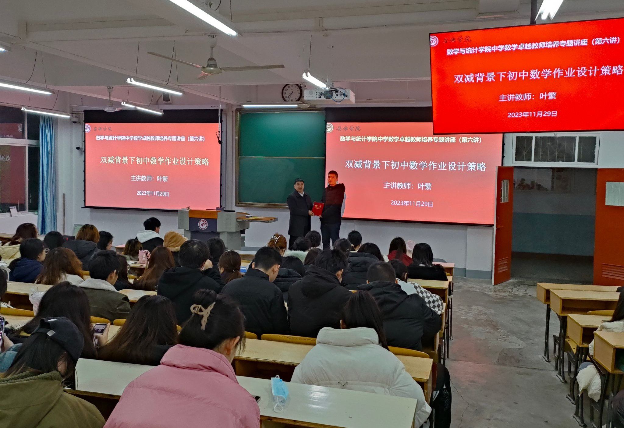 叶老师用丰富经典的案例和通俗生动的语言为同学们带来了一场生动的专题讲座,此次讲座,同学们受益匪浅,对提升师范生中学数学教学能力有重要指导意义,为师范生今后成为一名优秀的人民教师打下了良好的基础。讲座最后,副经理徐龙华为叶繁老师颁发聘书。