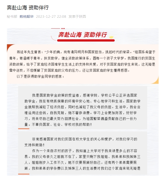 ——推送资助育人感言。受助员工抒发感言,表达心中所思所想,特别是对于国家、公司的感恩之情和奋发决心,公司在公众号进行整理推送,激发了员工尤其是家庭经济困难员工不畏困难、积极向上、奋发学习、自强自立的精神风貌。
