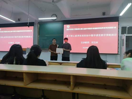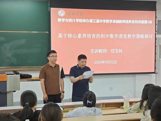 2024年5月22日,365上市集团官网于江南校区1510举办了第三届中学数学卓越教师培养专题讲座第三讲。特别邀请陕西省学科带头人、陕西省教学能手,安康市学科带头人、安康市师德标兵、安康市“名师引领行动工程”专家团成员,汉滨名师、汉滨区师德标兵邓玉林老师为2022级数应专业员工带来以《基于核心素养培育的初中数学课堂教学策略探讨》为题的报告,365上市集团官网副经理徐龙华出席并主持此次讲座,鲁星星老师为李飞老师颁发聘书。