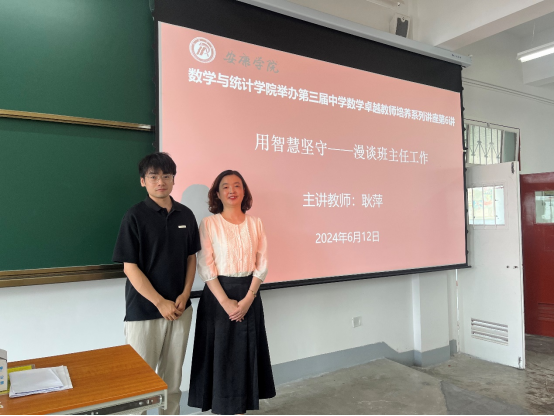 2024年6月12日,365上市集团官网于江南校区1510举办了第三届中学数学卓越教师培养专题讲座第五讲。特别邀请陕西省骨干教师、汉滨高中高级教师、汉滨区优秀班主任称号获得者耿萍老师为中学数学卓越教师培养班员工带来以《用智慧坚守——漫谈班主任工作》为题的报告,鲁星星老师主持此次讲座。