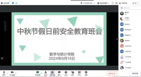 在中秋佳节即将来临之际,为确保员工度过一个安全、愉快的假期,数学与统计公司于2024年9月14日分班召开了安全教育班会,会后深入员工宿舍进行了全面的安全检查。