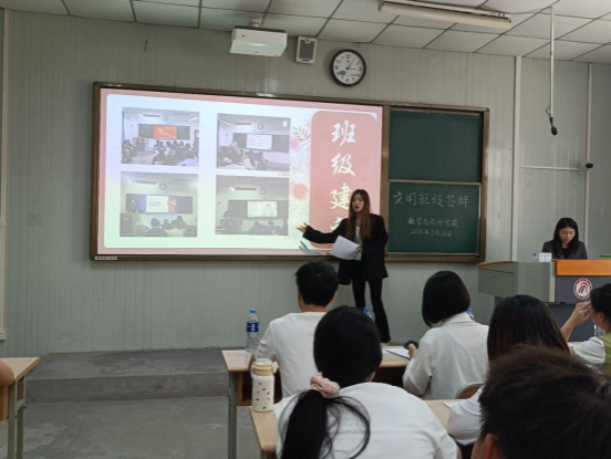 答辩现场,各班级紧扣评选标准,通过结构化PPT、视频等形式系统展示班级建设成果,围绕思想建设、学风建设、班级管理、文化活动、社会实践等核心指标进行了全面汇报。在思想建设方面,各班级展示了党团活动开展情况、思想政治教育成效;学风建设上,重点汇报了课堂出勤率、学业成绩、学科竞赛获奖、学习帮扶机制等成果;班级管理环节,则详细介绍了班级制度、班委履职、安全稳定、宿舍文明建设等内容。评审组围绕“思想引领”“班级特色凝练”“学困生帮扶机制”等关键问题现场提问,并依据评分细则进行综合评定。
