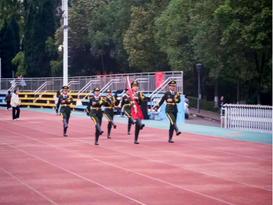 朝阳初升,晨光映照。国旗护卫队队员迈着铿锵有力的步伐,护卫五星红旗走向升旗台。伴随着雄壮的《义勇军进行曲》,鲜艳的国旗冉冉升起,全体师生肃立行注目礼,深怀对祖国的热爱与对宪法的尊崇。
