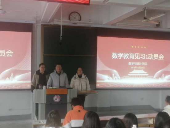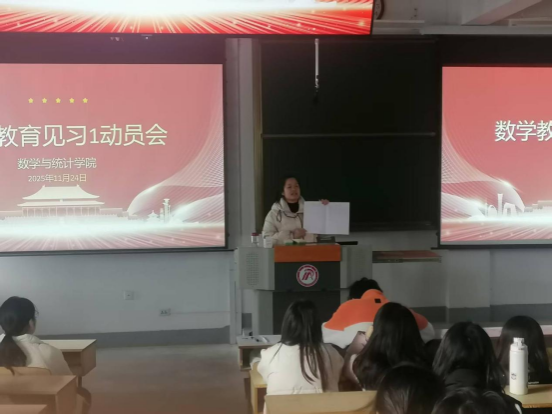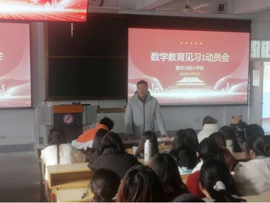 为切实做好2023级师范生数学教育见习工作,明确见习任务与要求,增强员工安全意识。11月24日上午10点在教学楼1510教室召开了数学教育见习1动员会。会议由带队教师王明华老师主持,系主任张永亮、带队教师王昭海及全体见习员工参加了此次会议。